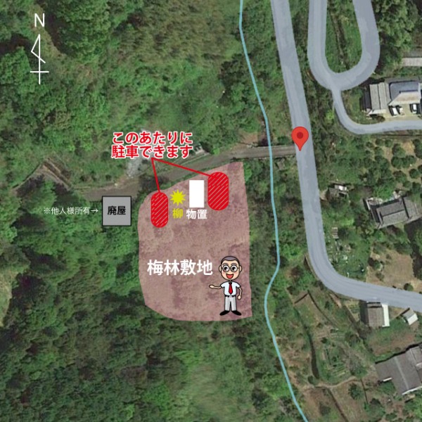 下図の 地点まで案内されるので現地の丁字路を西に進めば、すぐ左側が目的地です。