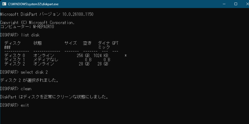 コマンドプロンプト等でdiskpartを実行したら、念の為認識しているディスクを確認しろ。